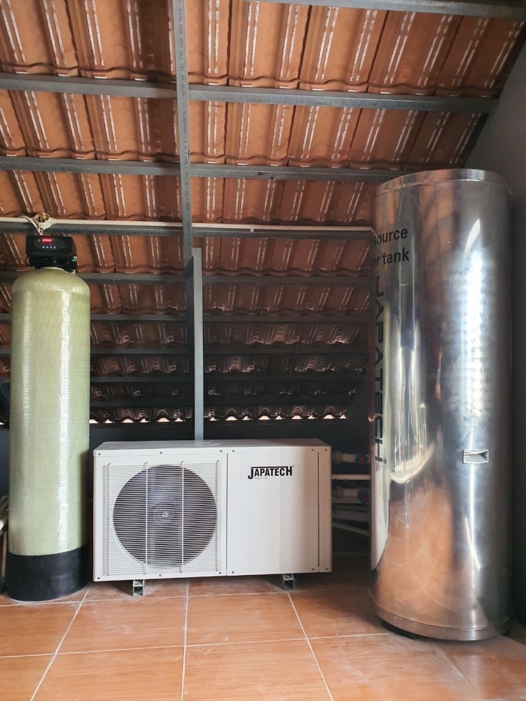Sử dụng bình bảo ôn 300L + Heatpump 150L/h. Ngoài ra khách hàng còn sử dụng cột lọc than hoạt than hoạt tính composit để khử màu,mùi trong nước.