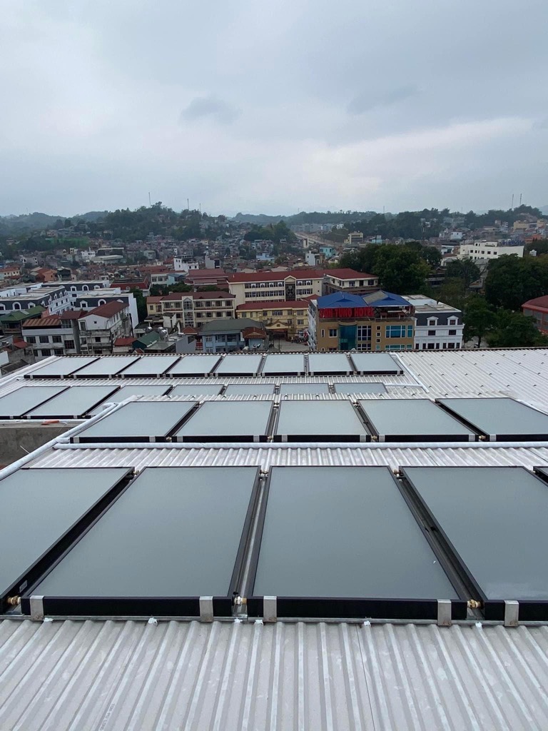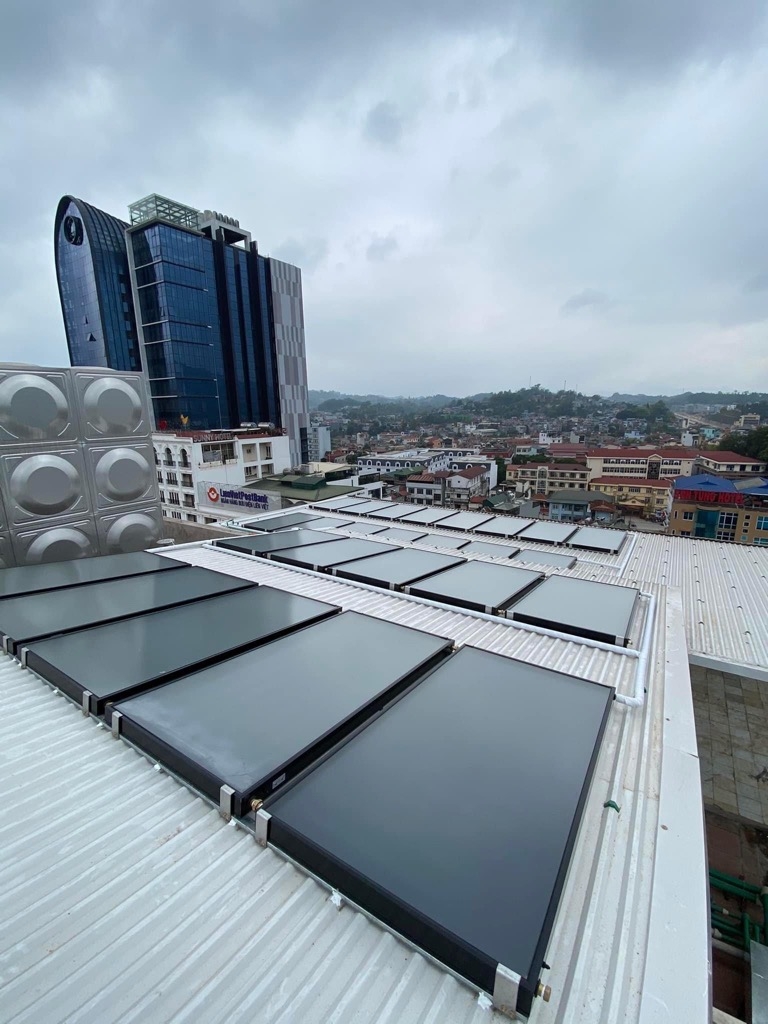 Sử dụng bình bảo ôn 8000 L + 25 tấm hấp thụ nhiệt kết hợp 2 Heatpump 800L/h cho khách sạn 100 phòng. Hệ thống hồi nước với tính năng mở vòi có nước nóng.